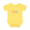 Soft, simple, and quietly joyful — this infant bodysuit wears friendship like a warm hug. Lightweight ribbed cotton holds its shape while the lap shoulder and three-snap closure make quick changes calm and easy. A gentle multicolor “besties” design sits small on the chest, adding playful color without overpowering tiny outfits. It’s the kind of piece parents reach for when they want baby to look cozy and cared-for — whether meeting new cousins, lingering at a slow morning coffee with friends, or capturing sleepy milestone photos.